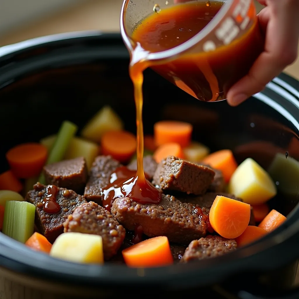 - Make the Gravy: In a bowl, whisk together the beef broth, tomato paste, Worcestershire sauce, and dried thyme. Pour this mixture into the slow cooker. Tuck the bay leaf into the stew.